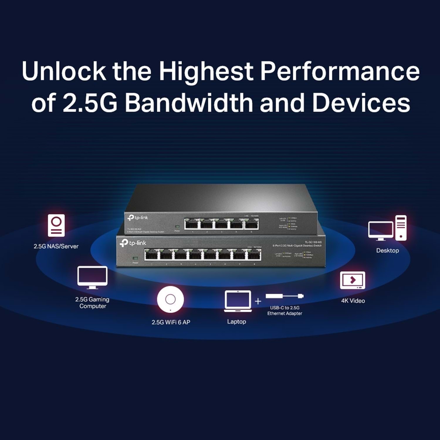 Yıldırım Hızında Bağlantılar. 2.5G NAS, 2.5G Sunucu, oyun bilgisayarı, 2.5G WiFi 6 AP, 4K video ve daha fazlası için yıldırım hızında bağlantı sağlar.